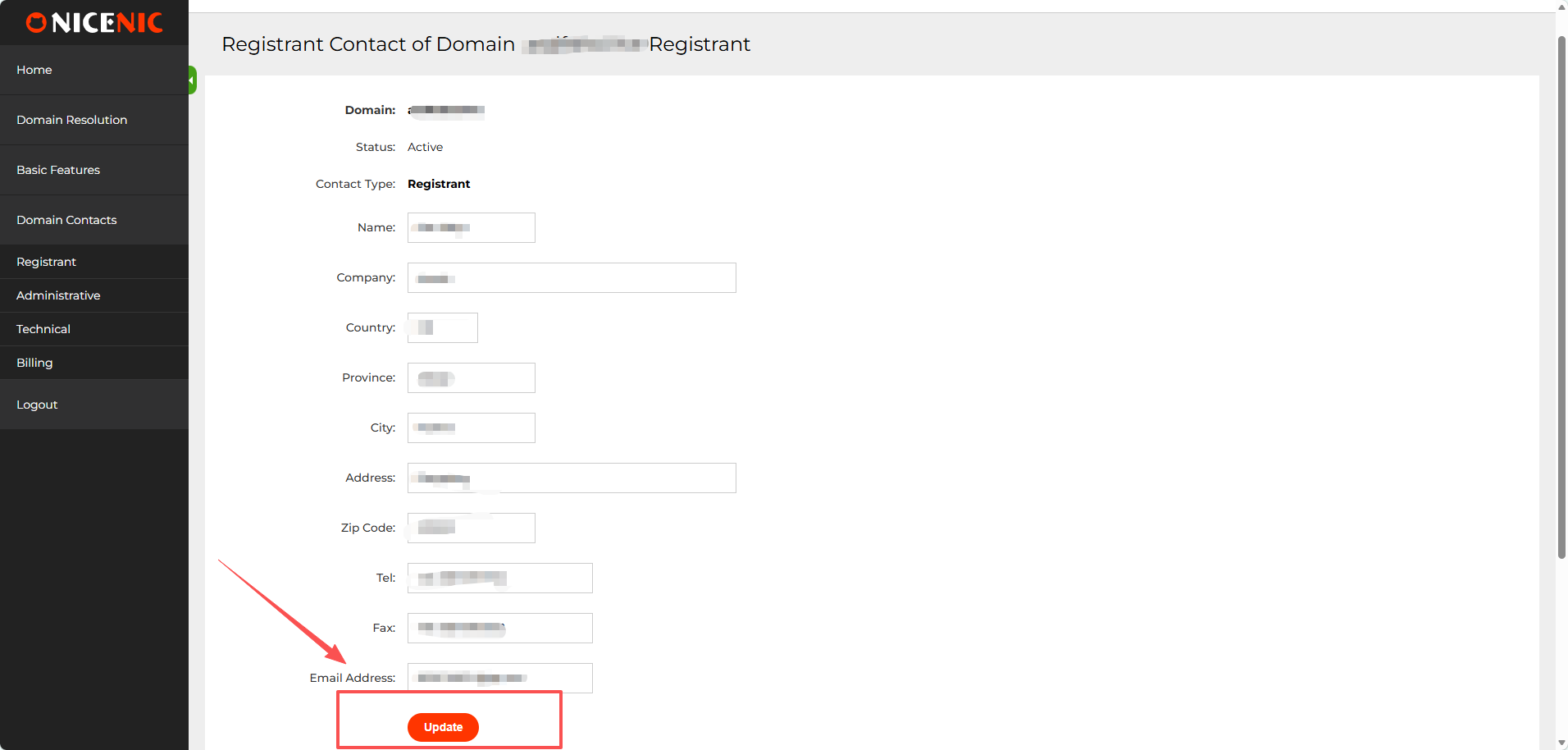 Seleccione el botón Mi Cuenta Mis Productoos > Nombre de dominio. Encuentre el nombre de dominio cuya infomación WHOIS desea modificar.