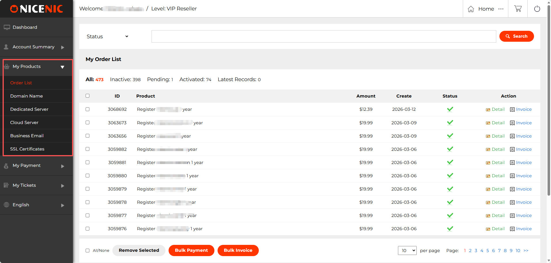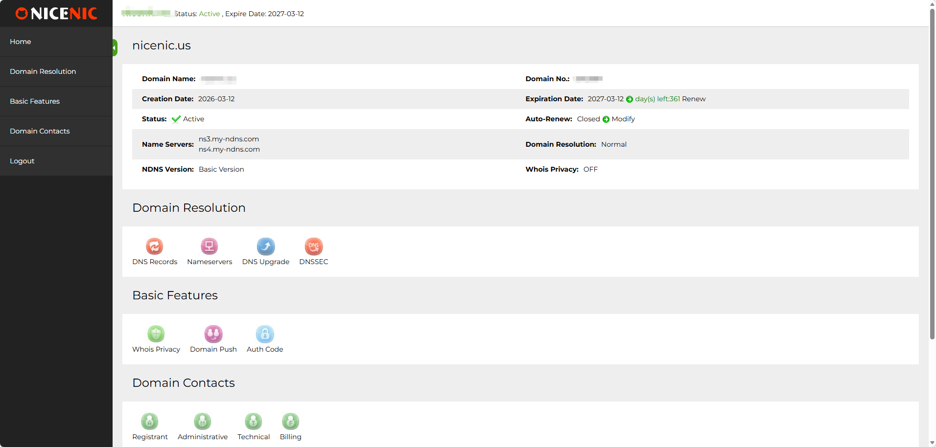 In the Mes produits section of Nicenic's User Panneau de contr?le, you'll find a variety of features designed to simplify the management of votre domains, servers, et other products. Below are the key components of this section: