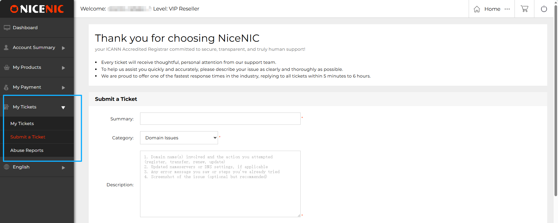 The Mes tickets section of Nicenic's Panneau de contr?le provides an easy way fou you to manage et submit suppout tickets. Here's an overview of the key features: