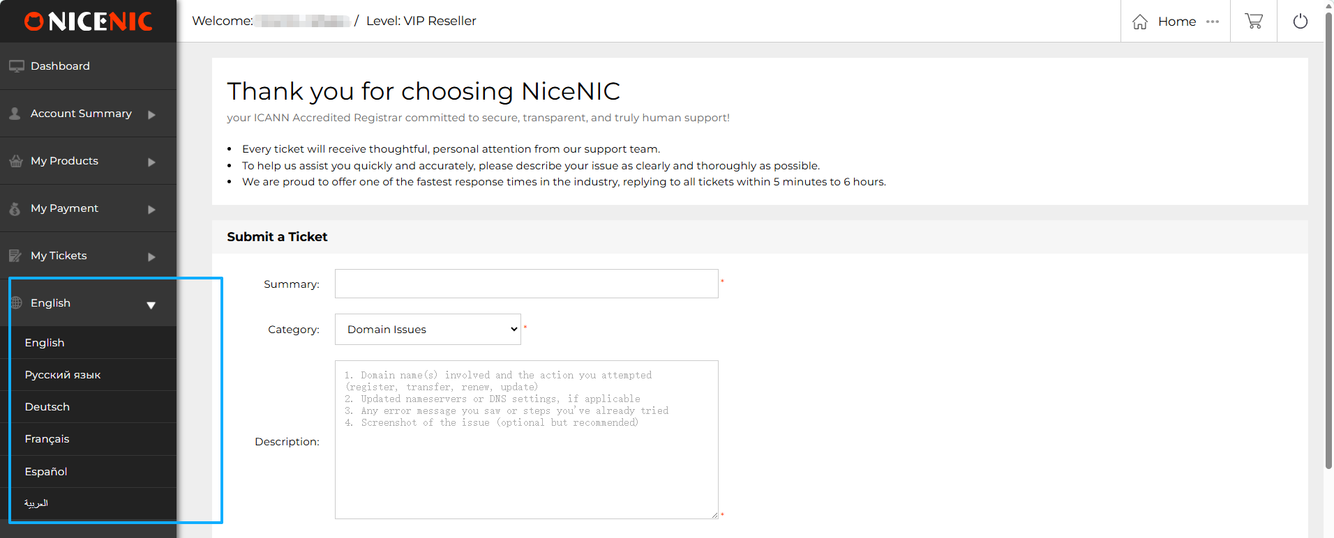 Nicenic's User Panneau de contr?le offers multi-language suppout to make domain management moue accessible. We currently provide the platfoum in six languages: